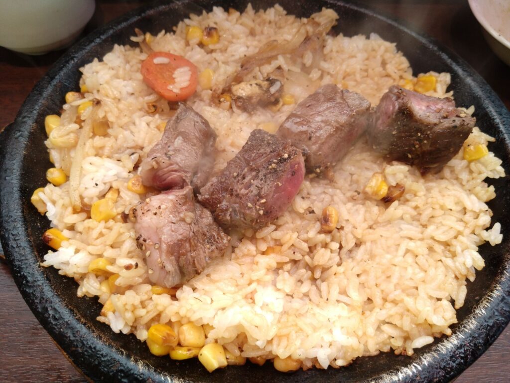 ご飯はお代わりOKなので、一杯目は肉が三分の二まで食べて、二杯目はちょっと肉で食べた後、残ったご飯を入れてソースをかけて混ぜてから、鉄板を再加熱してもらってます