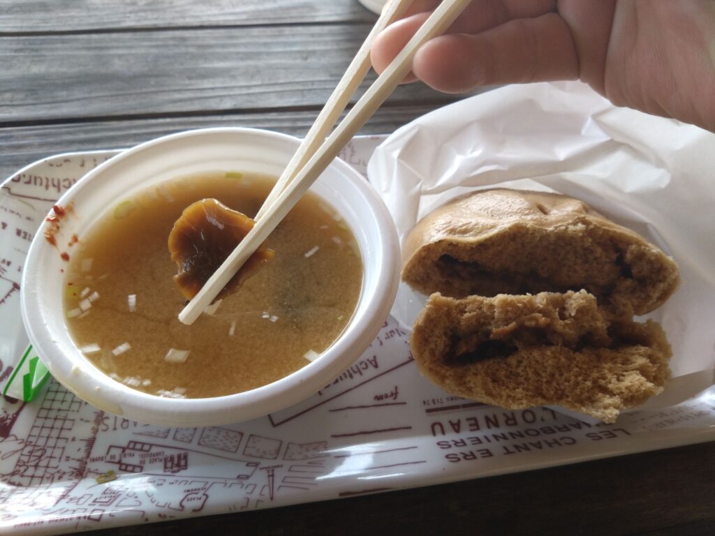 悩んだ末に、天然きのこ汁250円猪まん350円を食べました