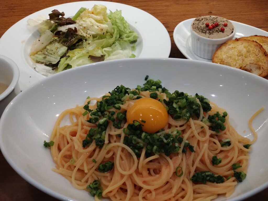 メインは、明太子パスタに卵黄が付いてます