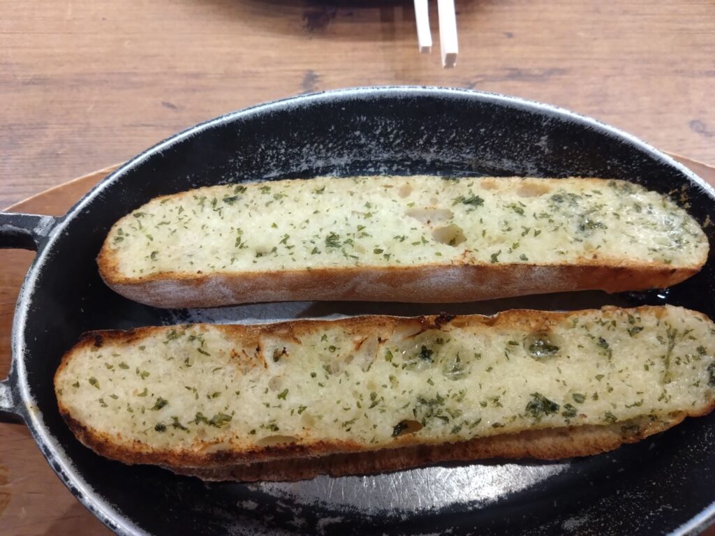 でも、レバーパテ感はあんまり感じませんでしたし、流石に付いてくる三枚のパンでは足りず、ガーリックトースト319円も追加しました
