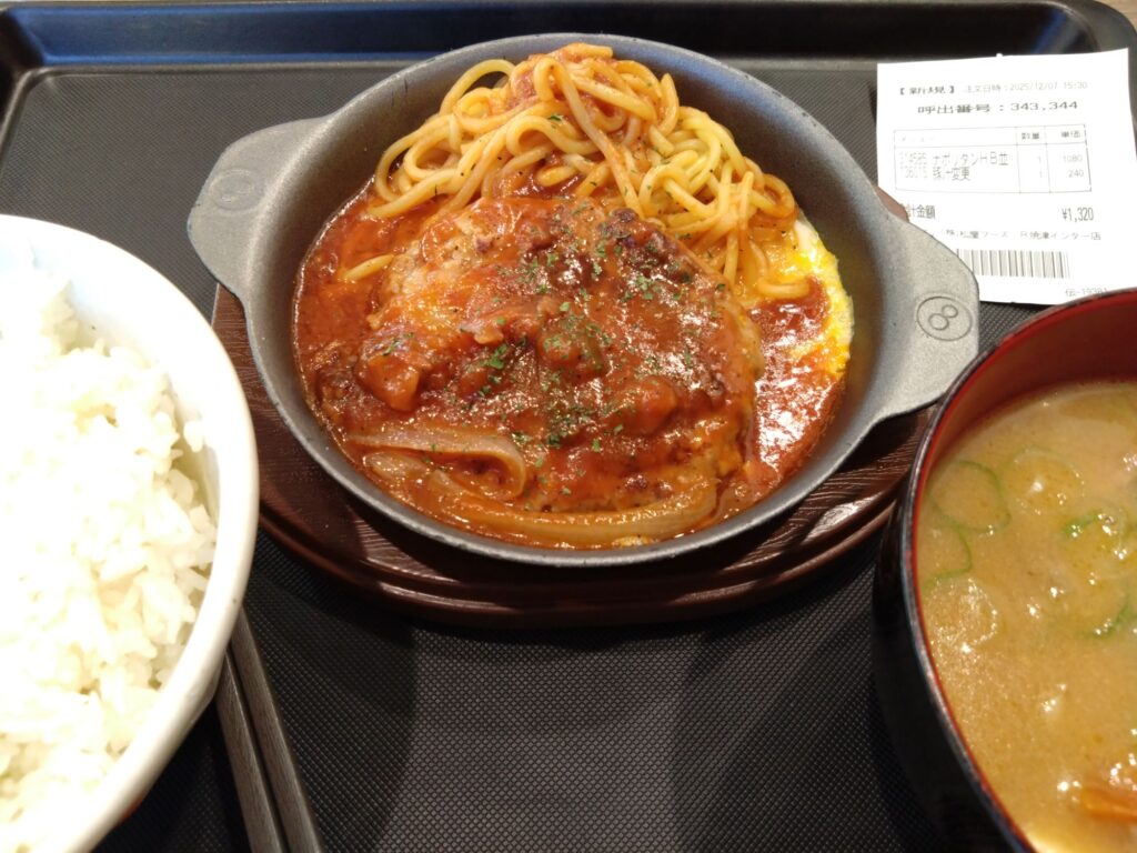 今日は、ナポリタンハンバーグ1080円に味噌汁を豚汁に変更240円にしました